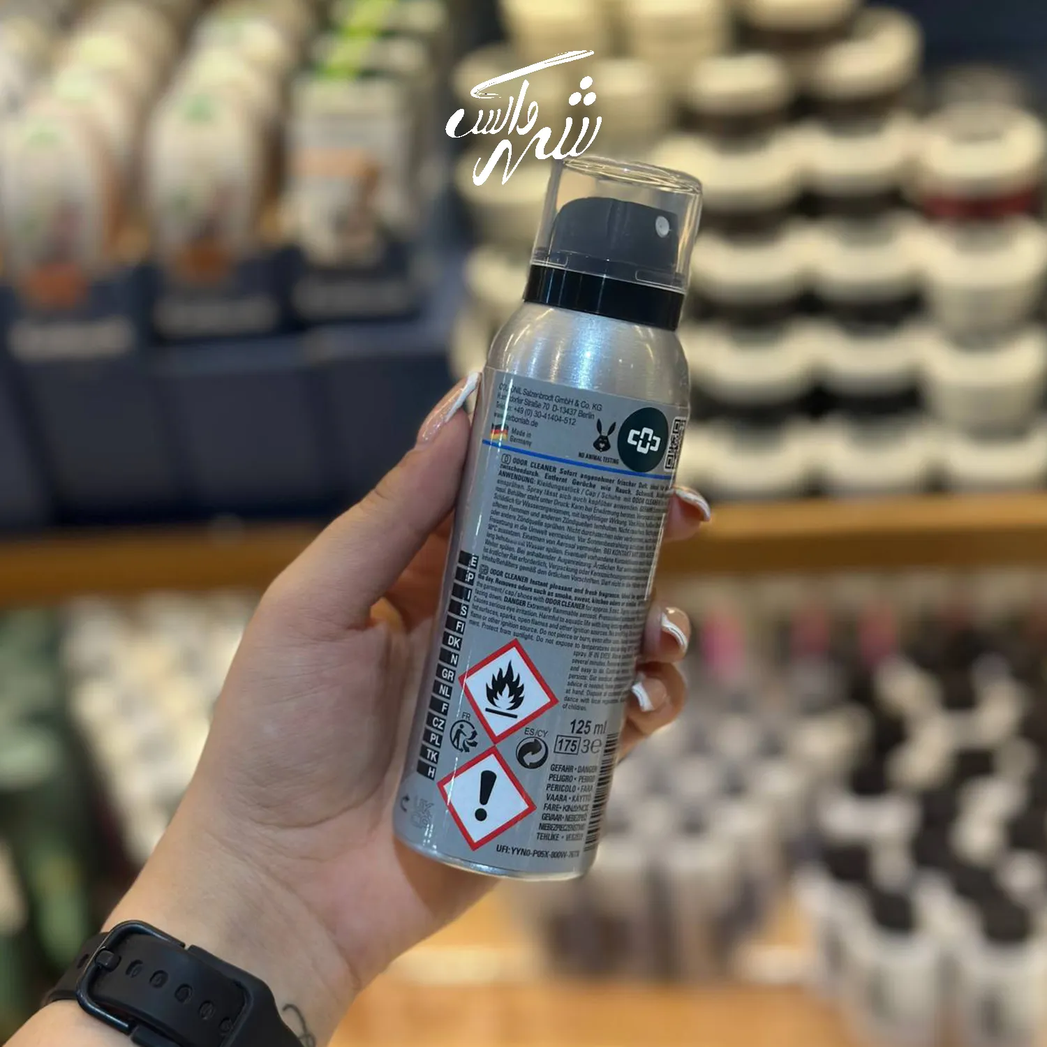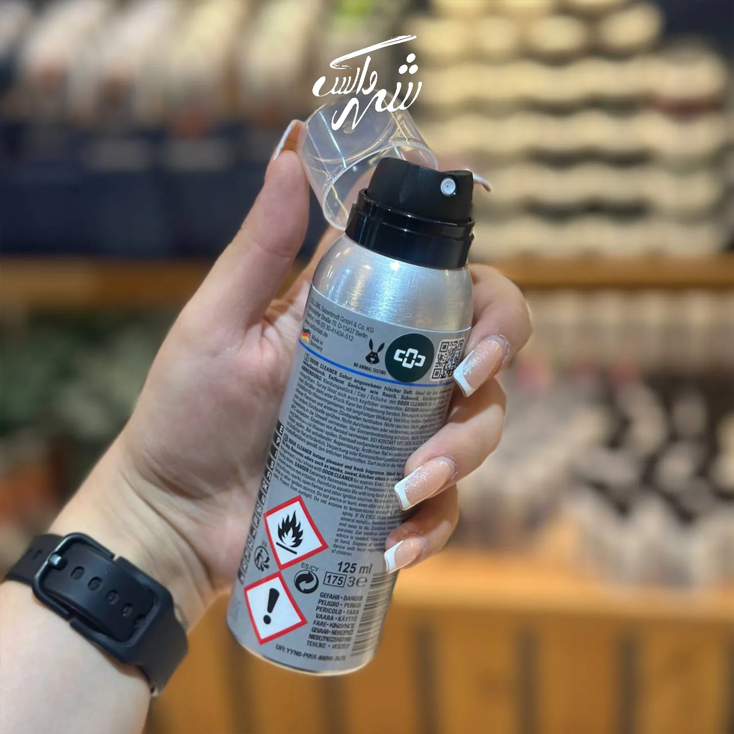 - دماغه اسپری را به مدت 5 ثانیه روی سطح مورد نظر (کفش، کلاه، لباس و…) فشار دهید.