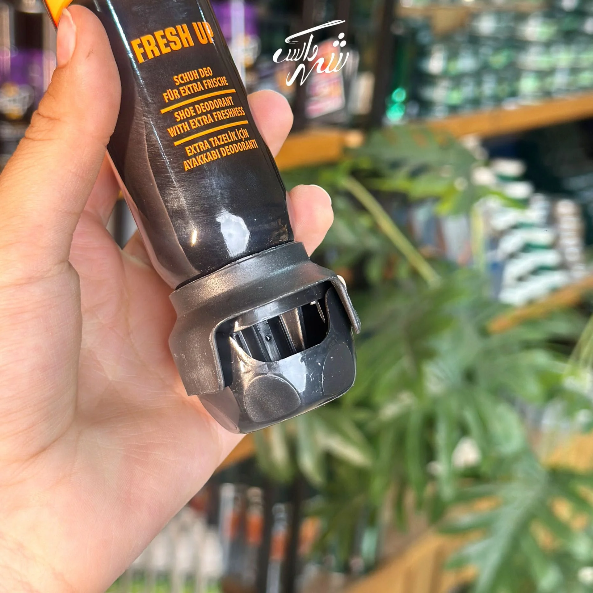 2️⃣ اسپری را درون کفش قرار داده و فشار دهید 🧴